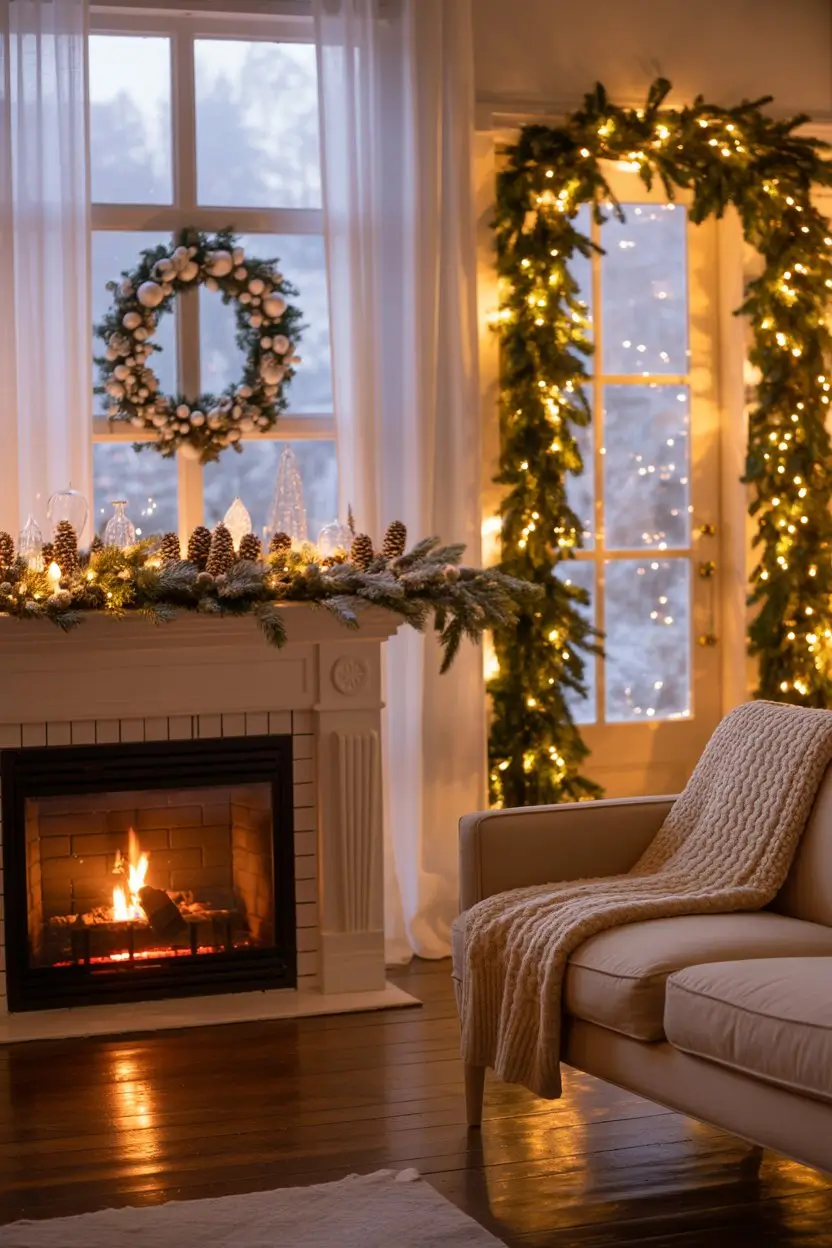 Windows and doorways frame your home, so they deserve attention. Hang wreaths with frosted foliage, drape garlands along the top edges, or add sheer white curtains that filter in soft winter light. At night, a few strands of twinkle lights in these areas can make the whole space glow.
