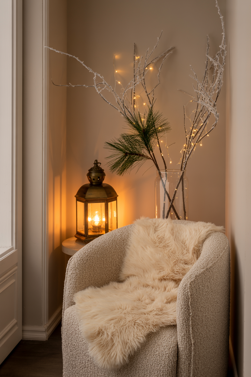 Look for small, underused spots in your home and give them seasonal charm. A reading nook can get a faux fur throw and a lantern. A hallway table might hold a small vase of frosted branches. These subtle touches carry the theme throughout the house.